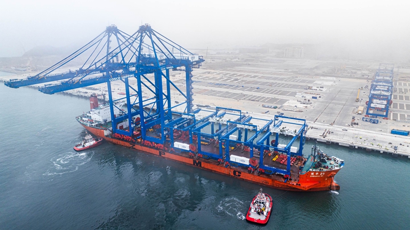 长长的防波堤宛若臂膀守护着崭新的港口,高高的吊桥将自上海驶来的“秘鲁轮”上装有中国“新三样”的集装箱卸下,又将满载秘鲁特色产品的集装箱装上即将驶往中国的“新上海轮”。